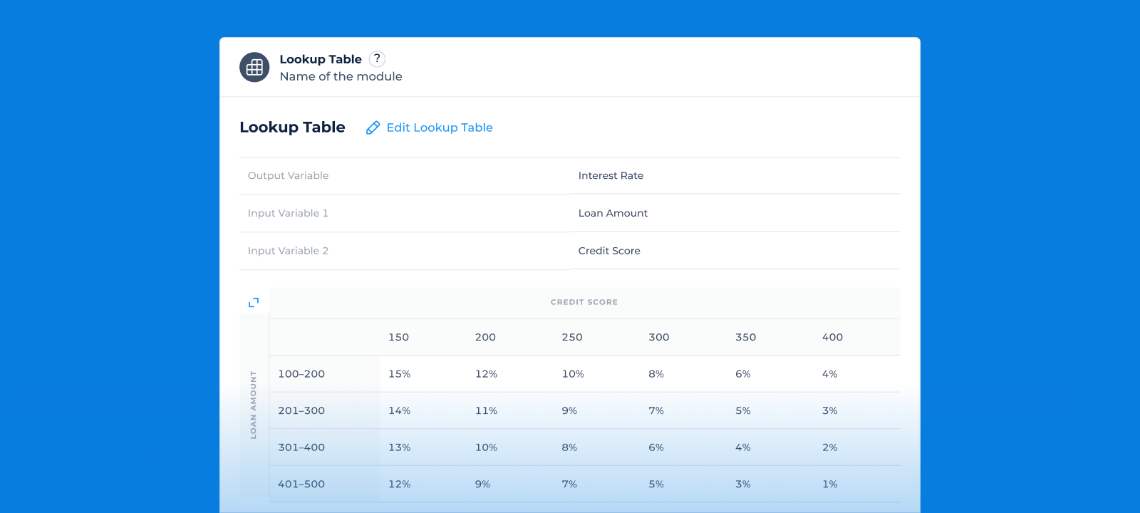 Traditionally, such conditional logic was implemented using formulas, resulting in repetitive and often difficult-to-read code. The Lookup Table module aims to change this by offering a more intuitive and user-friendly way of expressing and managing conditional logic, aligning with industry standards in credit underwriting.