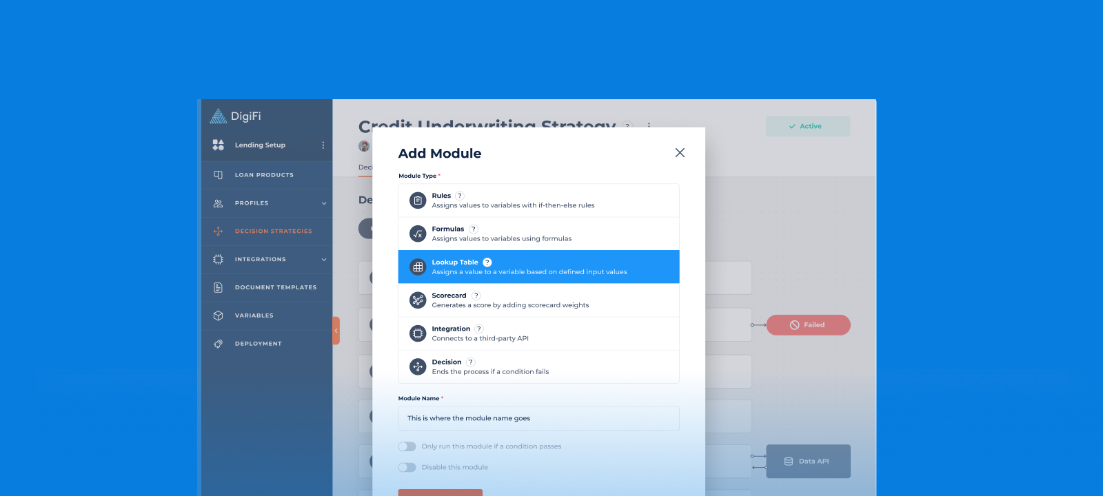 In summary, the "Lookup Table" module offers a practical and user-friendly solution for managing conditional logic in DigiFi's Decision Engine. Its simplicity and transparency enhance the decision-making process, providing lenders with a valuable tool to make informed choices while adhering to industry standards.