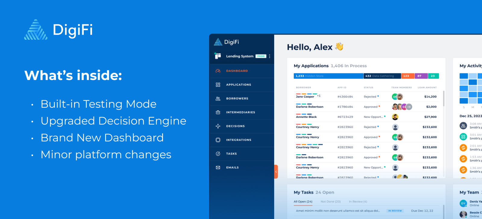 DigiFi’s lending system includes testing and production modes, tracks key configuration changes and allows you to instantly deploy changes to production with one click to ensure seamless and auditable change management.