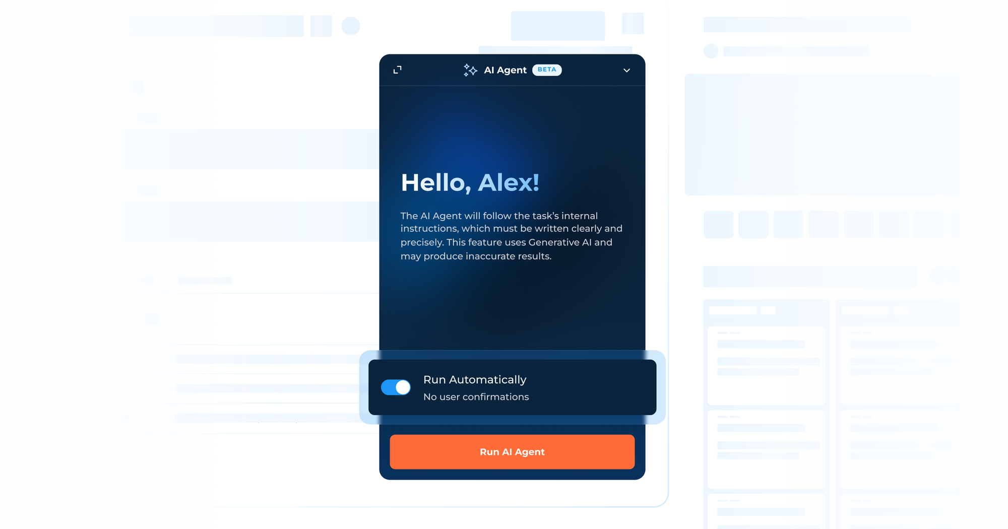 With AI Agent Automation, the Agent can now run tasks and workflows automatically and independently – without waiting for user confirmations – once it’s properly configured. This opens the door to true end-to-end automation.