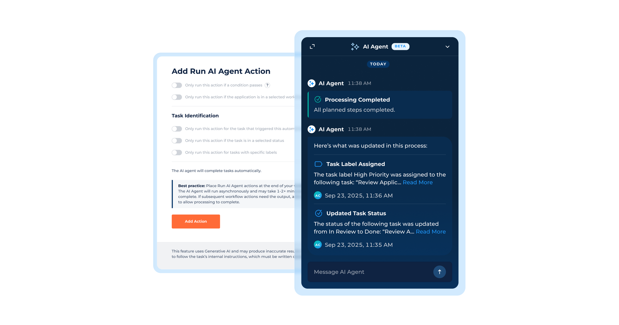 Launch automated Agent executions using the new Run AI Agent action in the Automation Builder. Once configured, the Agent can independently process defined tasks through automation workflows, exactly as designed.